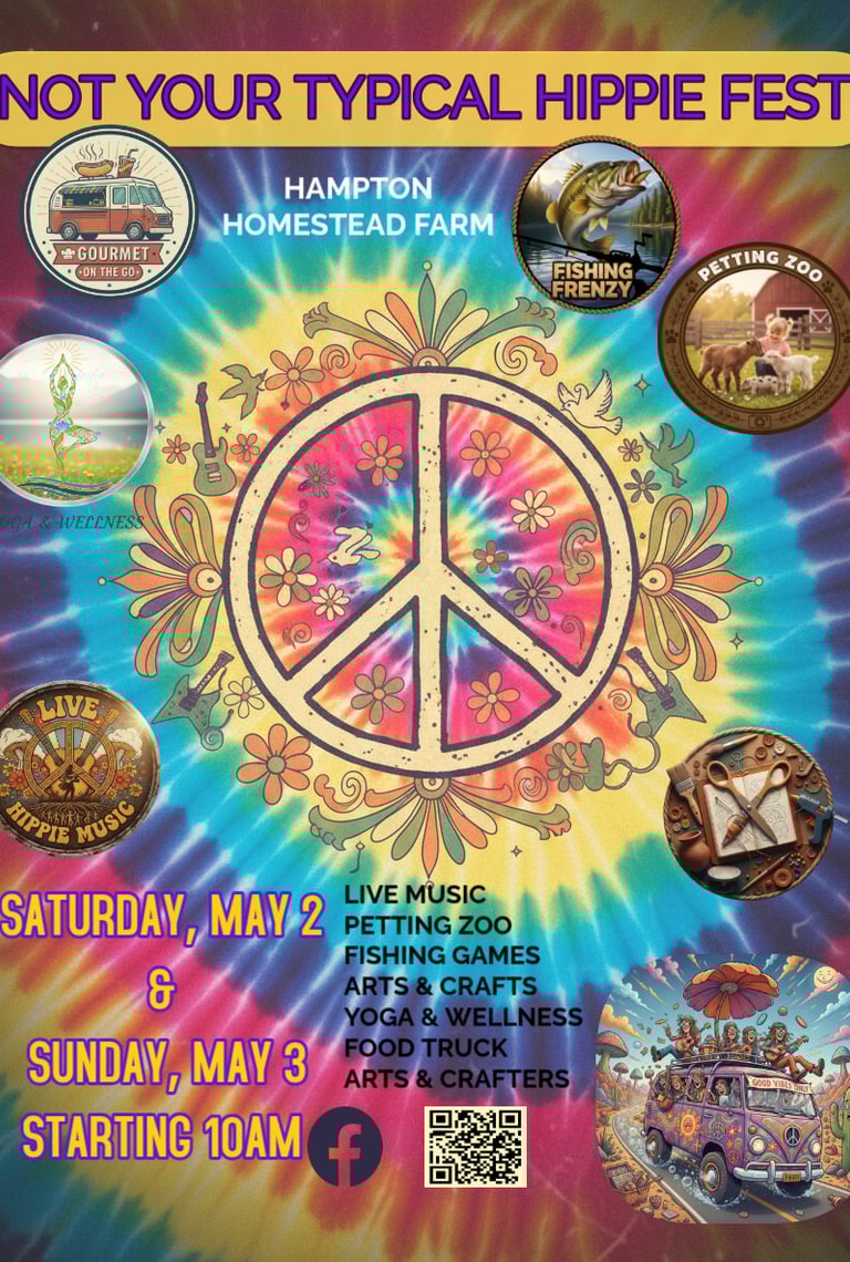 Join us for a vibrant, kid‑friendly Hippie Fest filled with good vibes and fun for all ages. This colorful outdoor event features live music, yoga sessions, a petting zoo, interactive entertainment, local artisans, unique vendors, delicious food trucks, and classic fishing‑style games for the little ones.